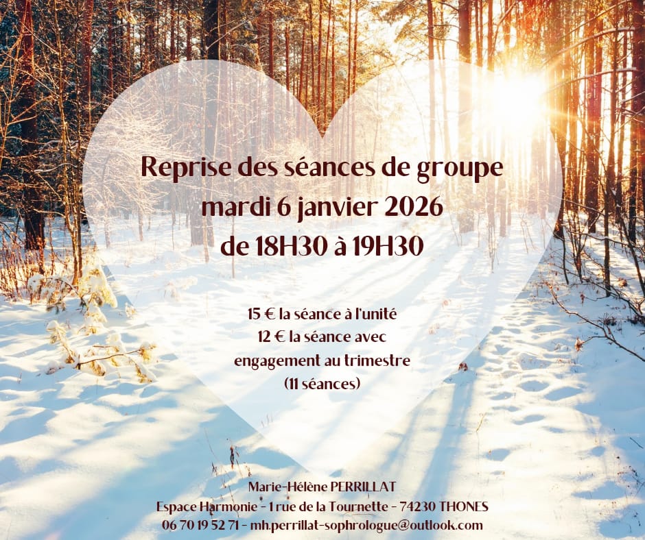 Apprendre à se débarrasser du surplus des fêtes, se libérer des contrariétés et des tensions accumulées et se préparer positivement pour la nouvelle année. tarif : 20€ Places limitées, réservation obligatoire auprès de Marie-Hélène au 06 70 19 52 71 ou mh.perrillat-sophrologue@outlook.com